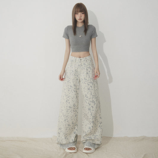 White Tie-Dye Printed Jeans for Women High Waist Loose Wide Leg Pants